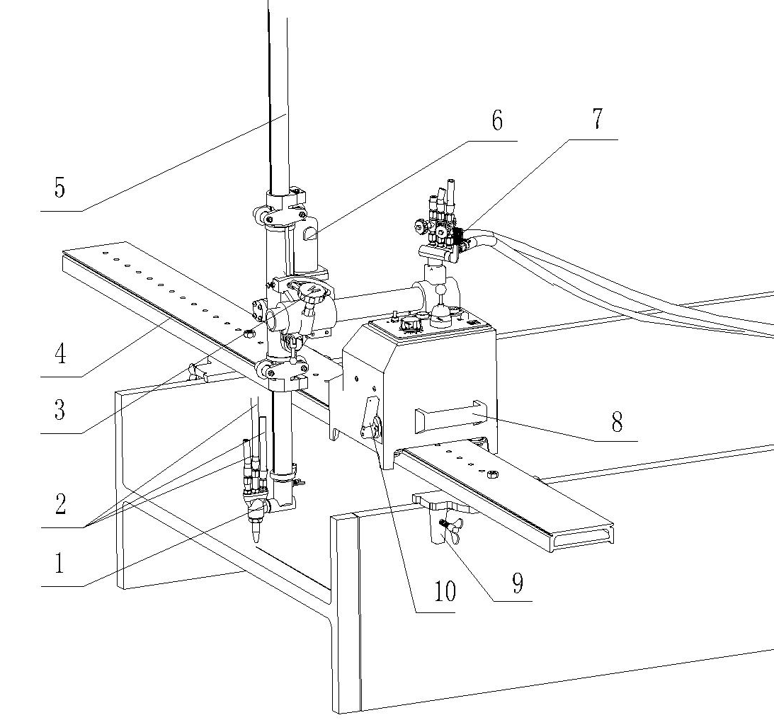 3.  橫向調節手輪:控制割炬的橫向移動            9. 軌道壓板:在H型鋼上定位機器