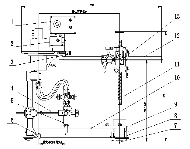 CG2-600-II割圓機是經用戶需要在CG2-600基礎上配以雙把割炬,經多方面改進研制的一種專用機型,切割法蘭內外圓可一次完成,有效提高了切割效率。本機采用兩檔變速,調速系統采用可控硅觸角調速,調節精確。割炬總路設有總閥,切割同厚度的鋼板只需調整火焰一次,以后無需再調整。本裝置配有氣體旋轉分配器,膠管不纏繞。本裝置,是切割同心圓零件的良好選擇。有效減少了勞動時間,降低了工人的勞動強度,一定程度地提高了工作效率。切割圓直徑   外徑  Ø200~Ø600,內徑  Ø100~Ø500