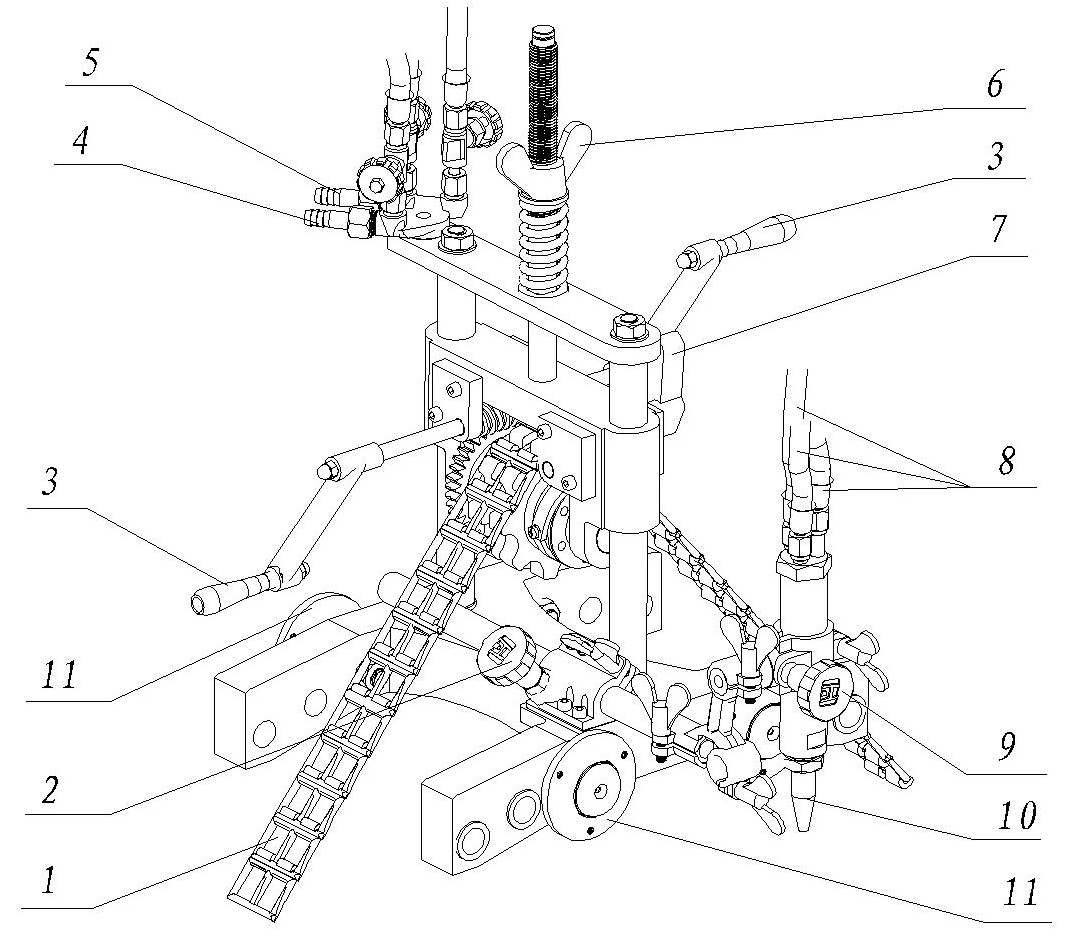 “CG2-11S”大手搖便攜式氣體切割機是基于現場實際情況進行了徹底的調查后而設計開發的一種經濟,實用的大直經管道切割機。該機器具有四只平行的行走輪,采用鏈條環繞鋼管鎖緊機器,通過手搖動方式運行機器。適合于250毫米以上大管徑無縫鋼管的切割。該機器結構獨特,操作簡便,易于維修,移動方便,切割輔助時間少。具有極高的可靠性。特別適用于野外無電源場所使用。機器底座設計有三組平行的安裝孔,當切割大管徑鋼管時,為了提高切割精度,可將四只平行的行走輪調換倒最外邊的一組安裝孔安裝。該機器裝有鏈輪的托架,可沿兩根軸上下滑動用以調緊或放松鏈條的拉力。驅動鏈條采用雙接搭扣式結構,逐節串聯而成。根據管徑的大小,可以方便,快速的增減。