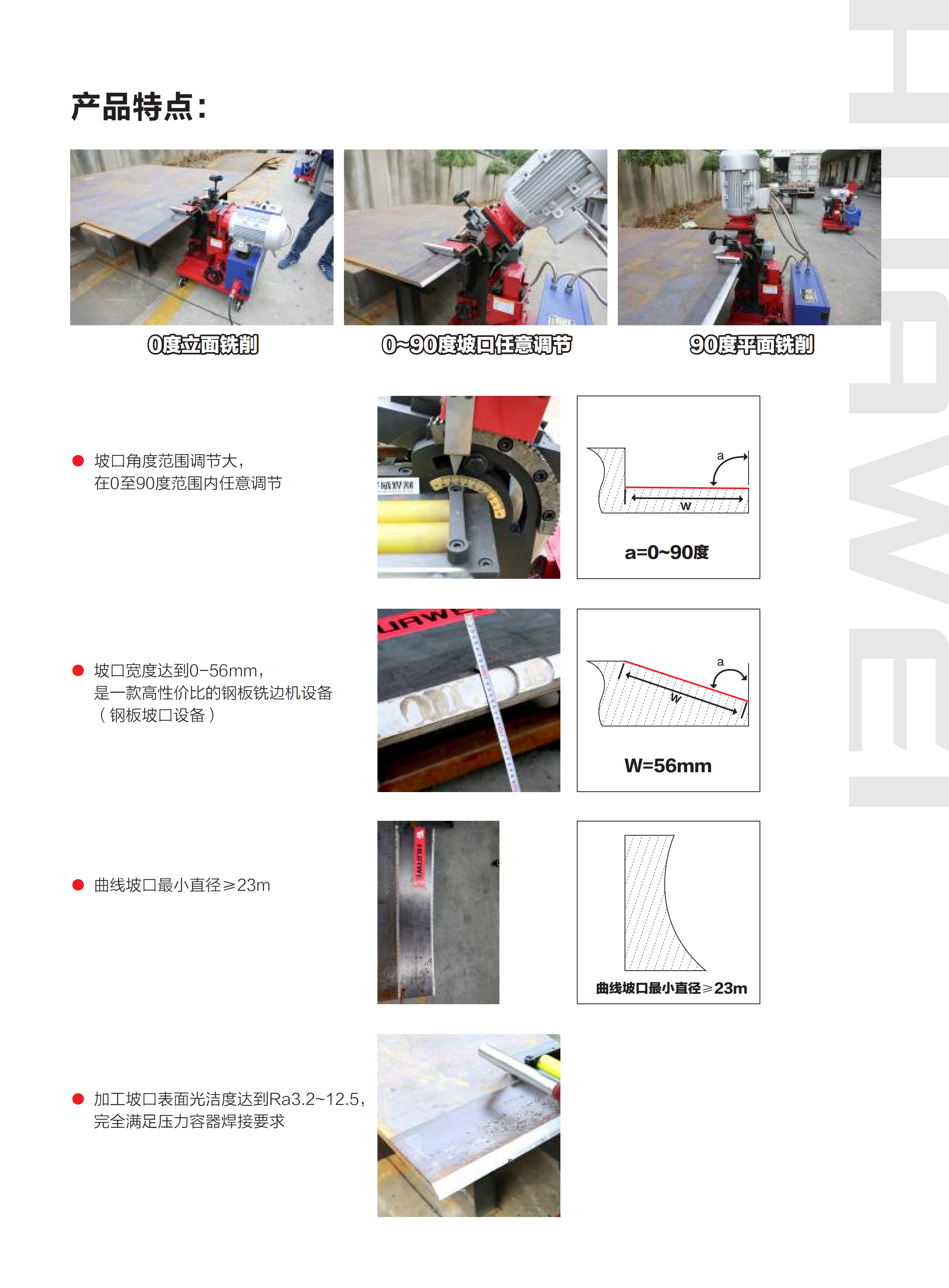 本產品是一款自動行進式銑邊設備,加工坡口過程中自動行進銑削,降低使用成本,減輕勞動強度,采用冷切削作業,加工后的坡口表面無氧化。坡口表面光潔度Ra3.2~6.3.完全符合焊接行業要求,無需去毛刺處理可以立即焊接使用,本品無污染,操作更加簡單。