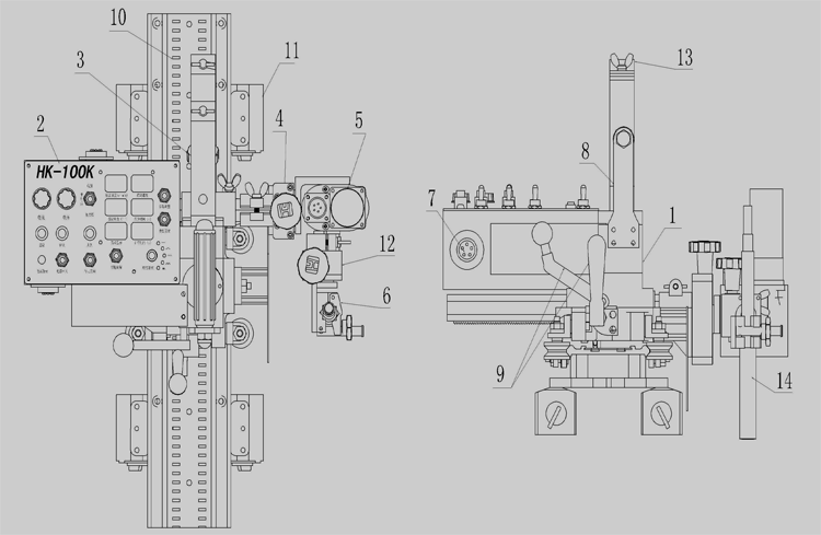 HK-100K由小車本體、控制箱,X-Y滑塊,焊槍夾具,導向輪,直線導軌等部件組成。