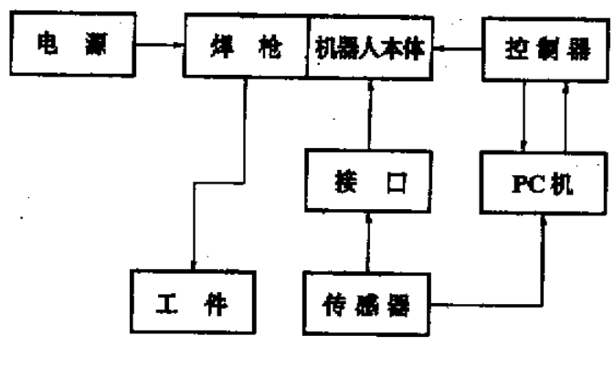 弧焊機器人焊縫跟蹤系統(tǒng)雖然經(jīng)過了幾十年的發(fā)展和計算機軟硬件的大力應(yīng)用, 但是整個系統(tǒng)的結(jié)構(gòu)沒有太大的變化?;『笝C器人焊縫跟蹤系統(tǒng)的結(jié)構(gòu)一般包括傳感器、 PC 處理機、 機器人專用控制器、 機器人本體及焊接設(shè)備等。傳感器采集到信號傳送到 PC 機, 經(jīng)過一系列的數(shù)據(jù)處理過程和圖像顯示后[3], PC 機與機器人專用控制器進行數(shù)據(jù)通訊, 然后將控制信號傳送給機器人本體控制焊接過程的正確運行。在系統(tǒng)結(jié)構(gòu)中, 焊槍與機器人本體是固定在一起的, 由多自由度的機械手來控制焊槍的方向、 位移和速度。傳感器的位置一般通過機械接口與機器人本體連接, 甚至采用鋼性連接并一起移動。PC 機在弧焊機器人焊縫跟蹤系統(tǒng)中的應(yīng)用是近幾年的事情, 在系統(tǒng)的跟蹤過程中, PC 機可以對傳感器接收的信號進行預(yù)處理, 通過圖像處理軟件在可視化界面上顯示焊接過程的工作狀態(tài), PC 機與機器人專用控制器進行數(shù)據(jù)通訊, 可以按照用戶的要求在離線編程的情況下對焊接過程進行跟蹤控制。系統(tǒng)框圖如圖所示。