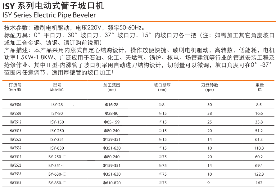 ISY系列內(nèi)漲式電動(dòng)管子坡口機(jī)是本公司研制的輕便型的鋼管坡口加工機(jī)具。該系列坡口機(jī)專為內(nèi)徑為Φ28~Φ360mm的鋼管倒角而設(shè)計(jì)。本系列鋼管坡口機(jī),采用交流220V電機(jī)作為動(dòng)力,內(nèi)漲式結(jié)構(gòu),自鋼管中心,操作方便。全新的設(shè)計(jì)理念和造型、卓越的使用性能,使其處于國內(nèi)坡口加工技術(shù)的領(lǐng)先地位。本機(jī)可對鋼管進(jìn)行坡口、平面法蘭加工。無論管壁厚薄,其加工性能與效率比起傳統(tǒng)工藝都有著不可替代的優(yōu)勢。