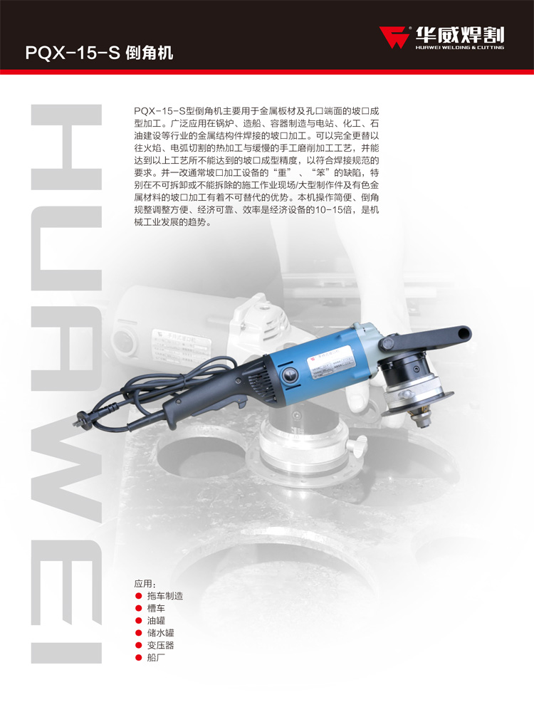 PQX-15-S型倒角機主要用于金屬板材及孔口端面的坡口成型加工。廣泛應用在鍋爐、造船、容器制造與電站、化工、石油建設等行業的金屬結構件焊接的坡口加工。可以完全更替以往火焰、電弧切割的熱加工與緩慢的手工磨削加工工藝,并能達到以上工藝所不能達到的坡口成型精度,以符合焊接規范的要求。并一改通常坡口加工設備的“重” 、“笨”的缺陷,特別在不可拆卸或不能拆除的施工作業現場/大型制作件及有色金屬材料的坡口加工有著不可替代的優勢。本機操作簡便、倒角規整調整方便、經濟可靠、效率是經濟設備的10-15倍,是機械工業發展的趨勢